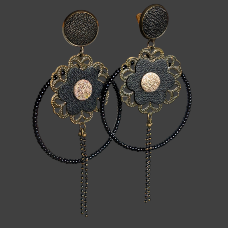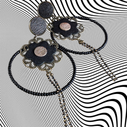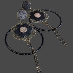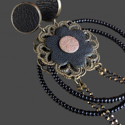 3 cuirs, 3 grains différents, 2couleurs Noir et Champagne scintillant...Fleurs et médaillons découpés et collés par mes soins