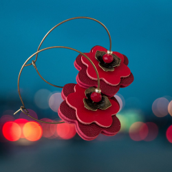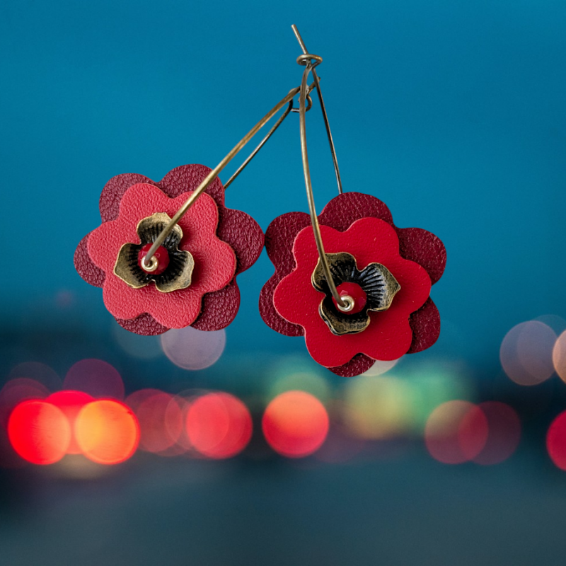 Fleurs en cuir aux tons Rouge , découpées, ajustées et collées par mes soins