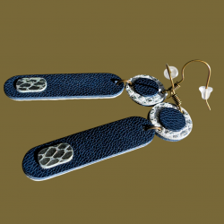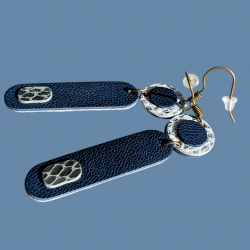 3 cuirs, 3 textures, 3 couleurs (Bleu marine, Blanc moucheté d'argent, argenté effet miroir), pièces découpées , ajustées et collées par mes soins