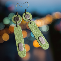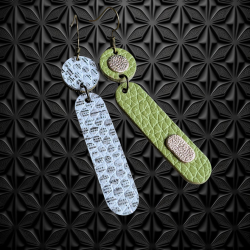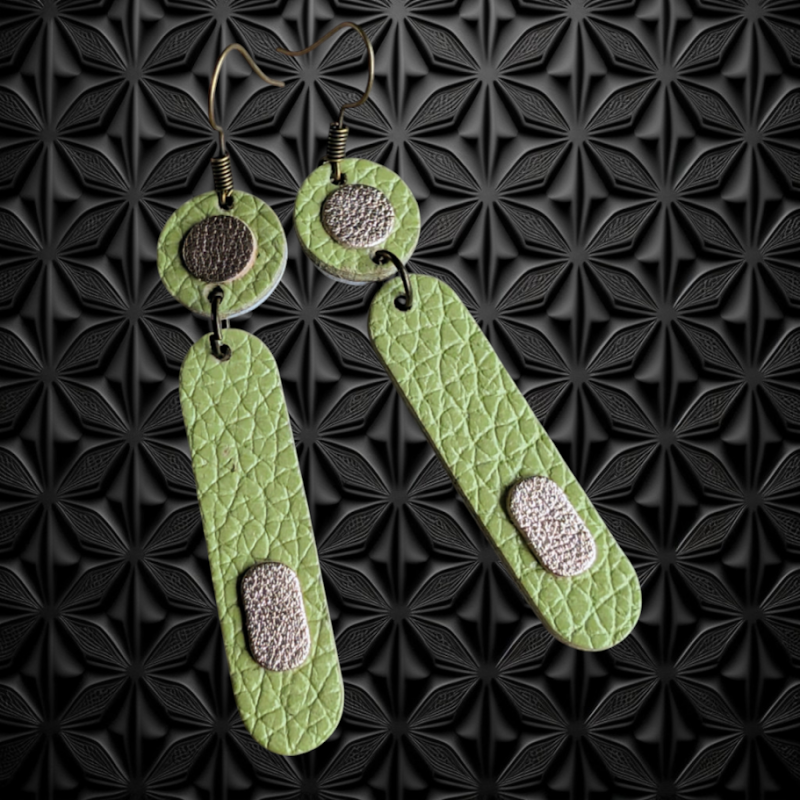 3 cuirs, 3 textures, 3 couleurs (Vert anis, Blanc moucheté d'argent, Champagne doré), pièces découpées , ajustées et collées par mes soins