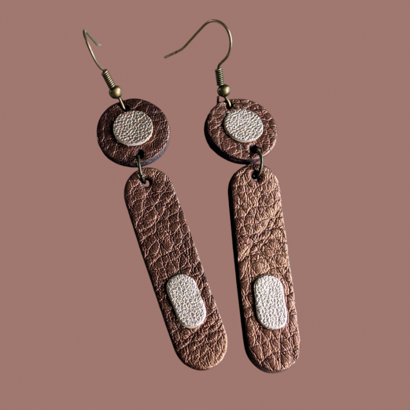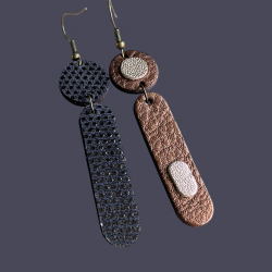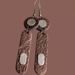 3 cuirs, 3 textures, 3 couleurs (Chocolat, Gris foncé moucheté , Champagne scintillant)... pièces en cuir découpées , ajustées et collées par mes soins