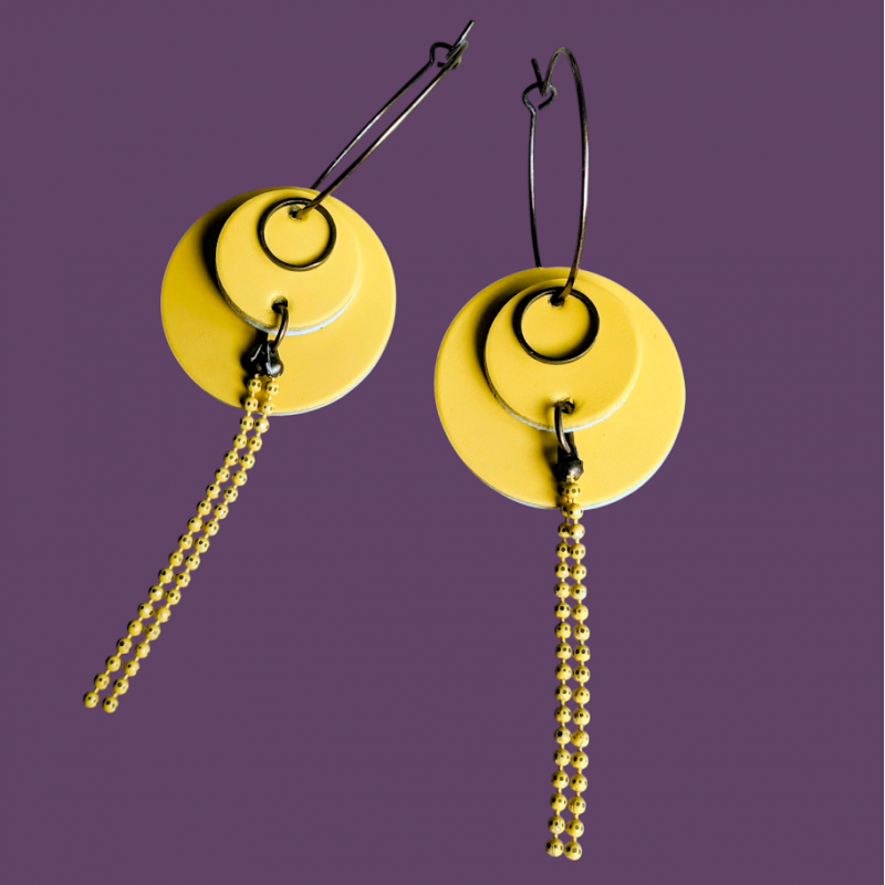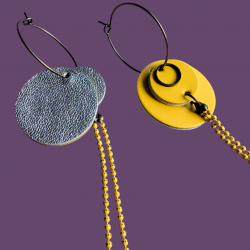 Médaillons de cuir (jaune et gris métallisé) , découpés, ajustés et collés par mes soins