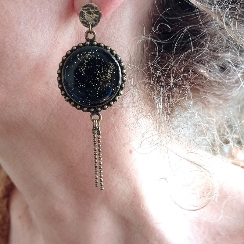 Joli médaillon rond avec une résine composée par mes soins...Petite touche d'éclat avec les paillettes dorées.